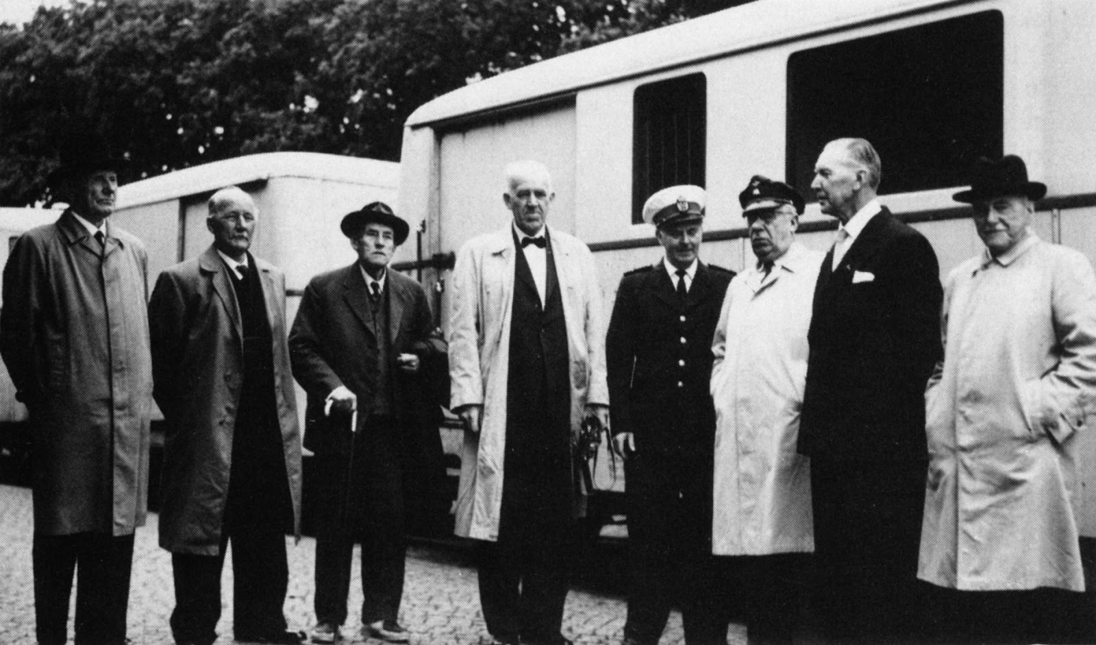 | Öländska järnvägsveteraner fotograferade i samband med att SJ tog över Ölands Järnvägar 1947. Folke B Sundberg står som tredje man från höger. Bild ur boken ”Ölands Järnvägar” (1987) |